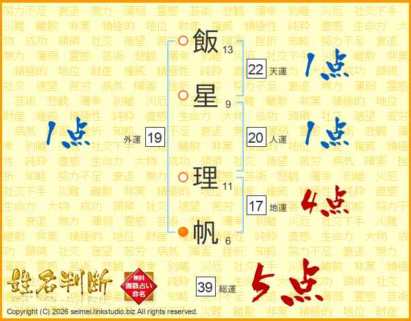 飯星理帆さんの総運は39画の5点!