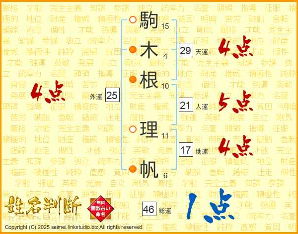 駒(15画)木(4画)根(10画) 理(11画)帆(6画)