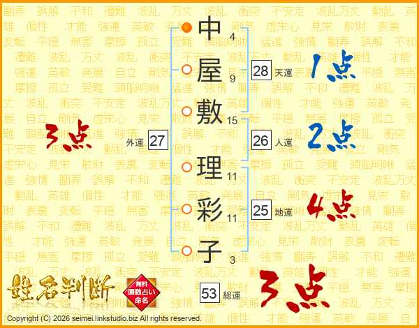 中(4画)屋(9画)敷(15画) 理(11画)彩(11画)子(3画)