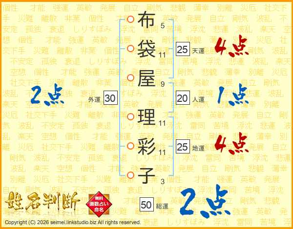 生活面を象徴する運勢です。外部から受ける影響力を表し、結婚運、家庭運や職場、環境への順応性を表します。総運から人運を引いた画数。姓や名が1文字の場合を除く。