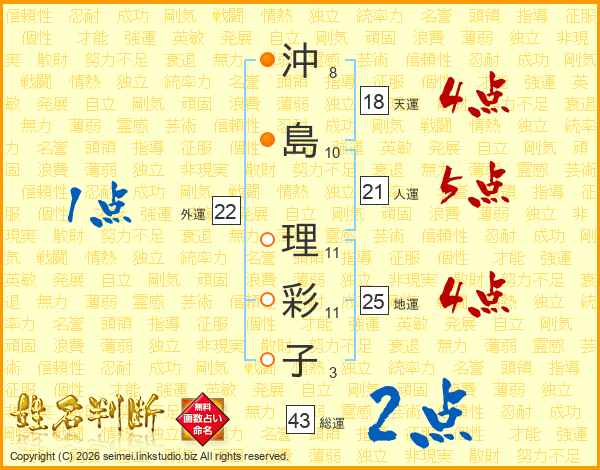 沖(8画)島(10画) 理(11画)彩(11画)子(3画)