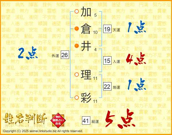 加(5画)倉(10画)井(4画) 理(11画)彩(11画)