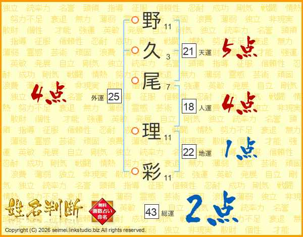 野(11画)久(3画)尾(7画) 理(11画)彩(11画)