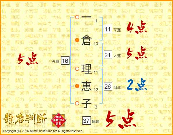 一(1画)倉(10画) 理(11画)恵(12画)子(3画)