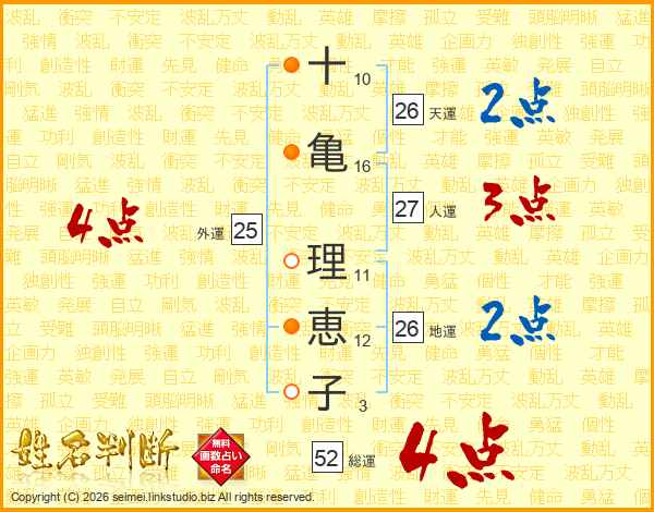 十(10画)亀(16画) 理(11画)恵(12画)子(3画)