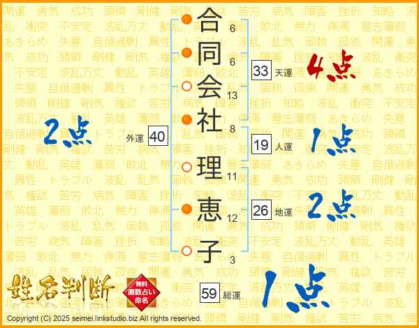 合(6画)同(6画)会(13画)社(8画) 理(11画)恵(12画)子(3画)