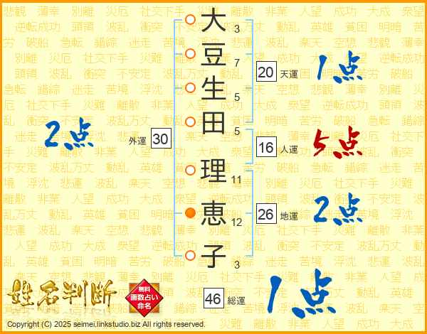 大(3画)豆(7画)生(5画)田(5画) 理(11画)恵(12画)子(3画)