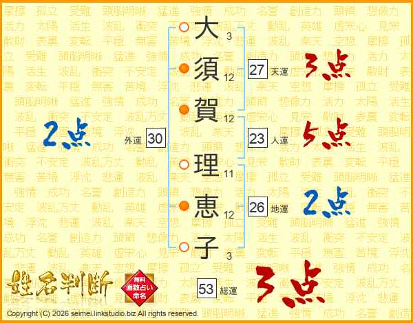 大(3画)須(12画)賀(12画) 理(11画)恵(12画)子(3画)