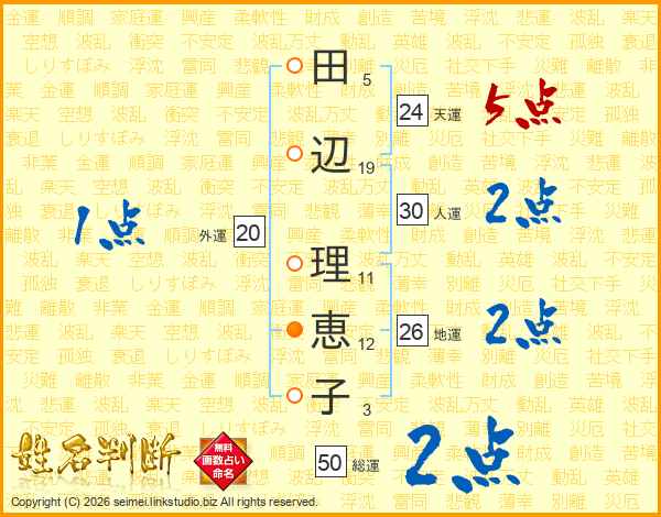 田(5画)辺(19画) 理(11画)恵(12画)子(3画)