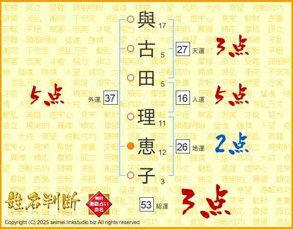 與(17画)古(5画)田(5画) 理(11画)恵(12画)子(3画)