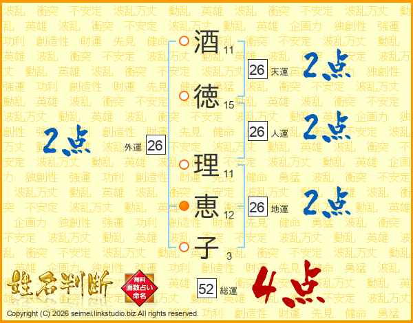 酒(11画)徳(15画) 理(11画)恵(12画)子(3画)