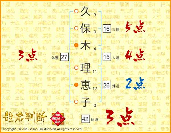久(3画)保(9画)木(4画) 理(11画)恵(12画)子(3画)