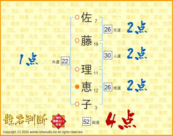佐(7画)藤(19画) 理(11画)恵(12画)子(3画)
