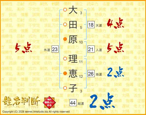 大(3画)田(5画)原(10画) 理(11画)恵(12画)子(3画)