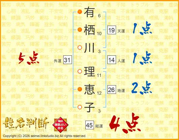 有(6画)栖(10画)川(3画) 理(11画)恵(12画)子(3画)