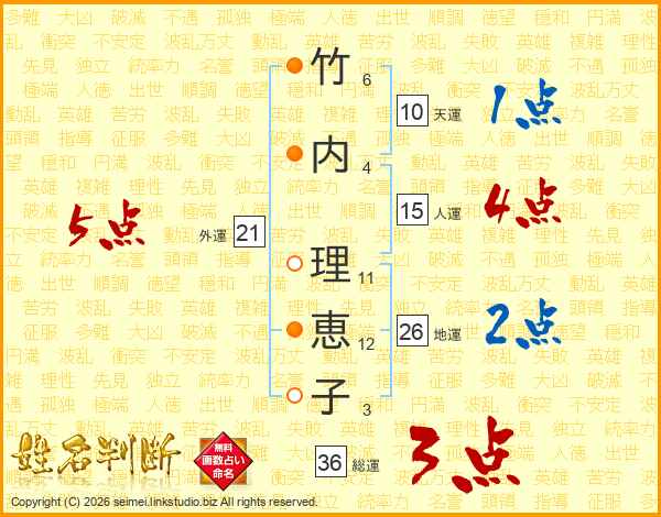 竹(6画)内(4画) 理(11画)恵(12画)子(3画)