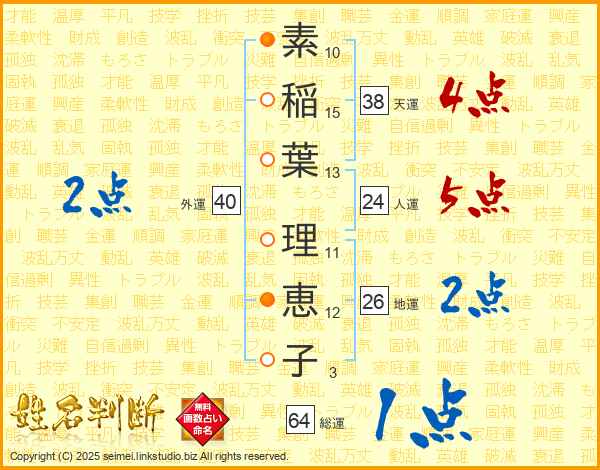 素(10画)稲(15画)葉(13画) 理(11画)恵(12画)子(3画)