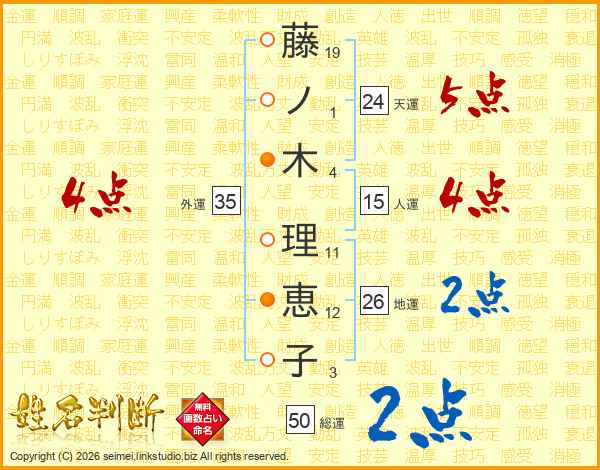 藤(19画)ノ(1画)木(4画) 理(11画)恵(12画)子(3画)
