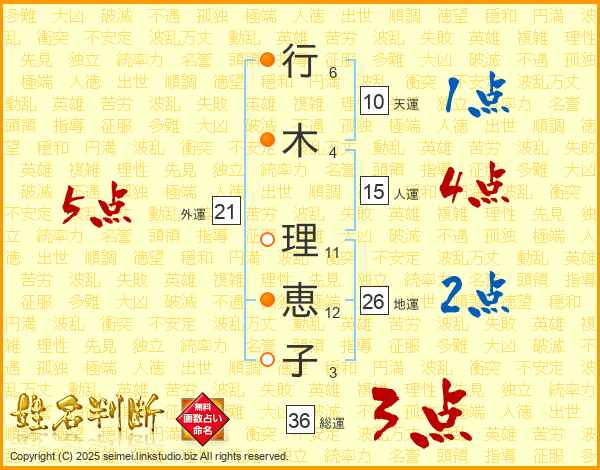 行(6画)木(4画) 理(11画)恵(12画)子(3画)