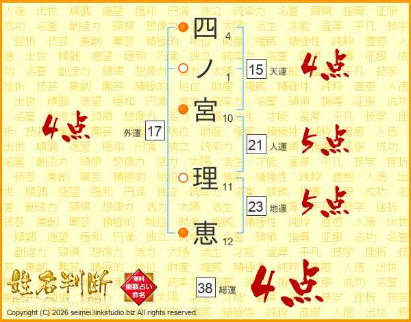 四(4画)ノ(1画)宮(10画) 理(11画)恵(12画)