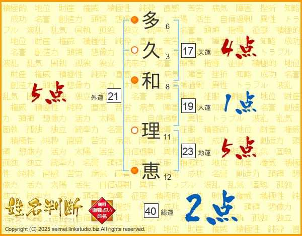 多(6画)久(3画)和(8画) 理(11画)恵(12画)