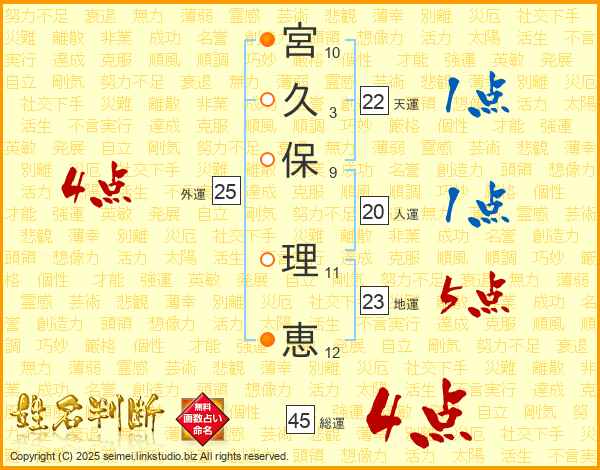 宮(10画)久(3画)保(9画) 理(11画)恵(12画)