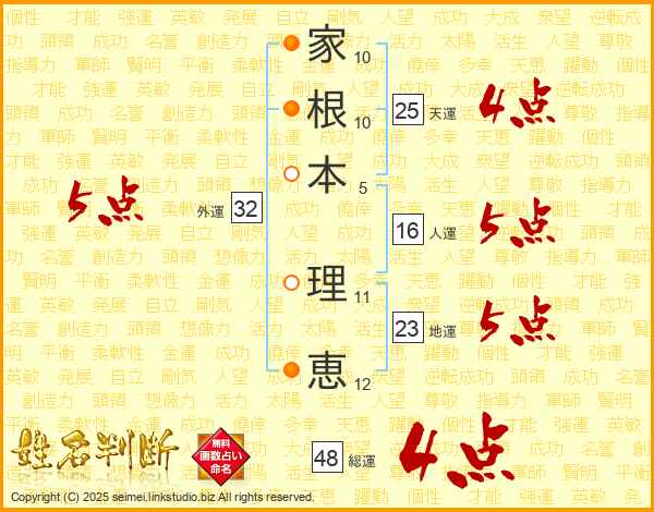 家(10画)根(10画)本(5画) 理(11画)恵(12画)