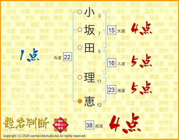 小(3画)坂(7画)田(5画) 理(11画)恵(12画)