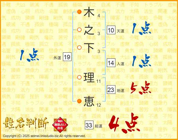 木(4画)之(3画)下(3画) 理(11画)恵(12画)