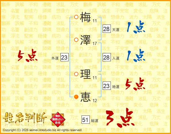 梅(11画)澤(17画) 理(11画)恵(12画)