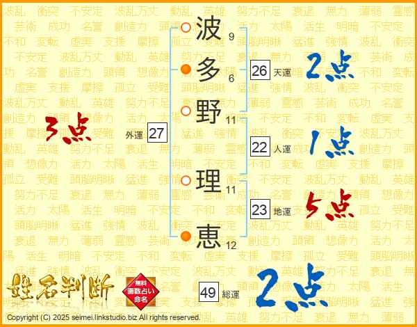 波(9画)多(6画)野(11画) 理(11画)恵(12画)