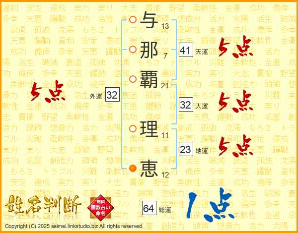 与(13画)那(7画)覇(21画) 理(11画)恵(12画)