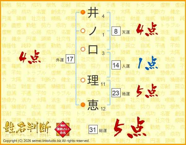 井(4画)ノ(1画)口(3画) 理(11画)恵(12画)