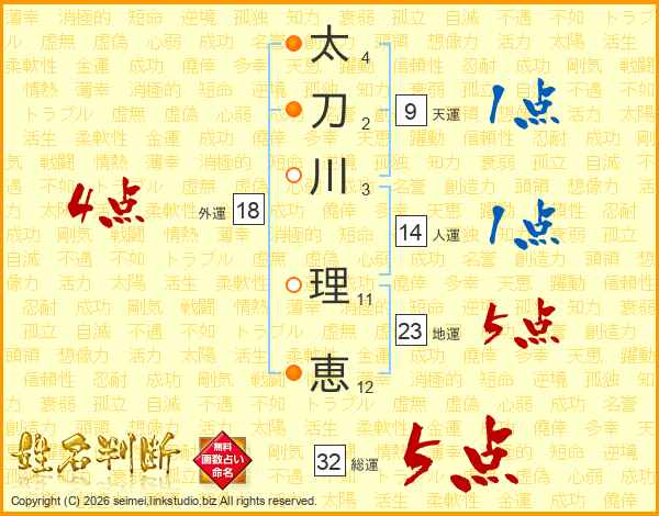 太(4画)刀(2画)川(3画) 理(11画)恵(12画)