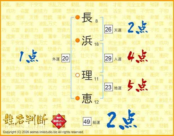 あなたの人生を表す1番重要な運勢です。生涯を通じて影響する総合運となり、主に50歳以降の晩年期に影響を及ぼします。苗字と名前の合計画数。