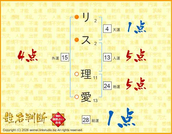 リス理愛さんの総運は28画の1点!