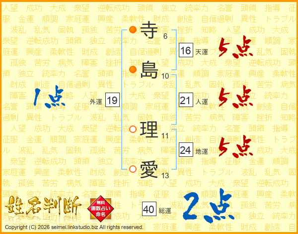 寺(6画)島(10画) 理(11画)愛(13画)