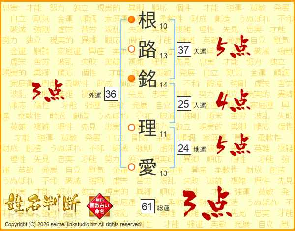 根(10画)路(13画)銘(14画) 理(11画)愛(13画)