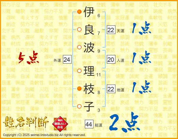 伊(6画)良(7画)波(9画) 理(11画)枝(8画)子(3画)