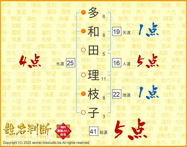 多(6画)和(8画)田(5画) 理(11画)枝(8画)子(3画)