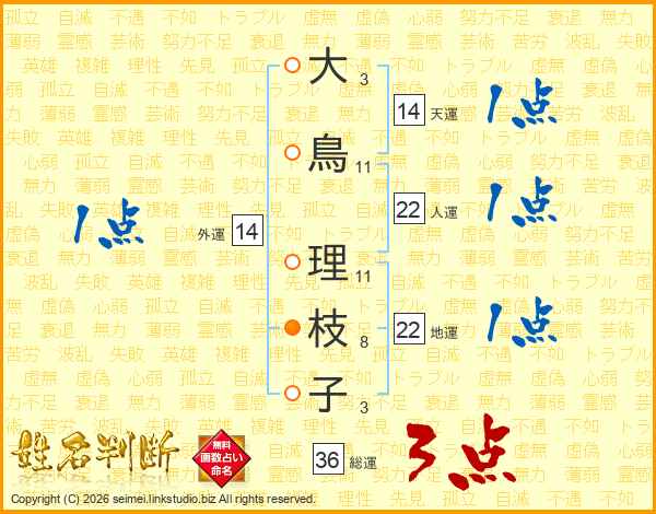 大(3画)鳥(11画) 理(11画)枝(8画)子(3画)