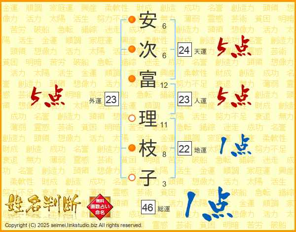 安(6画)次(6画)富(12画) 理(11画)枝(8画)子(3画)