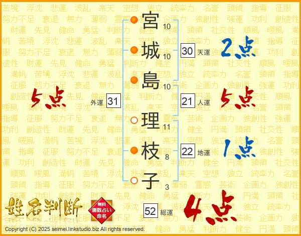 宮(10画)城(10画)島(10画) 理(11画)枝(8画)子(3画)