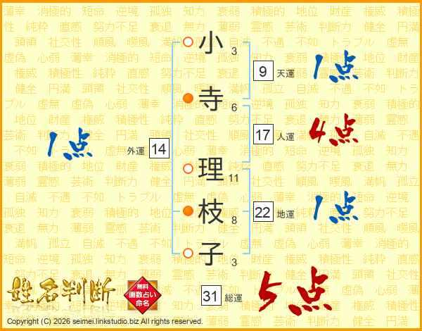 小(3画)寺(6画) 理(11画)枝(8画)子(3画)