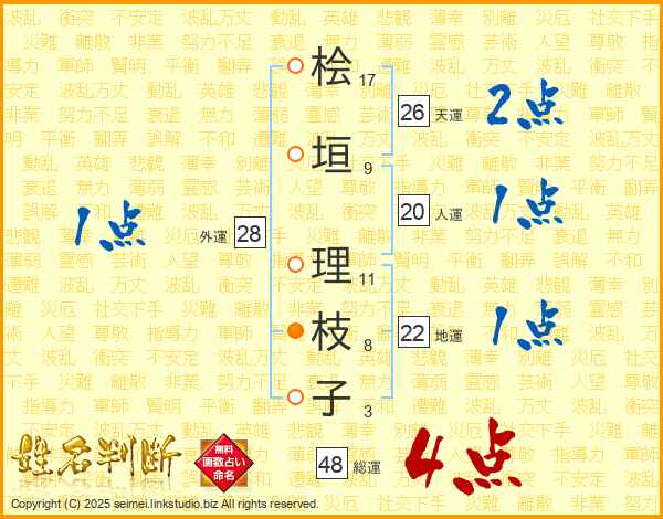 桧(17画)垣(9画) 理(11画)枝(8画)子(3画)
