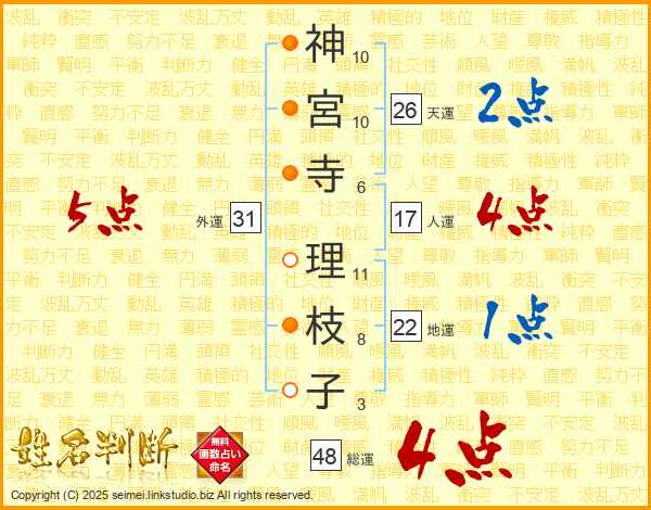 神(10画)宮(10画)寺(6画) 理(11画)枝(8画)子(3画)