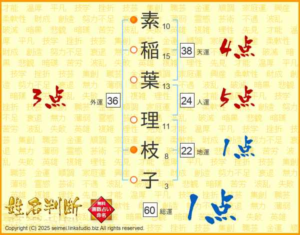 素(10画)稲(15画)葉(13画) 理(11画)枝(8画)子(3画)
