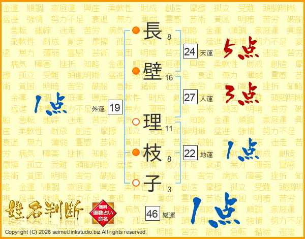 長(8画)壁(16画) 理(11画)枝(8画)子(3画)