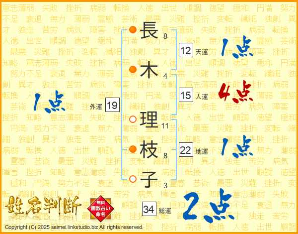 長(8画)木(4画) 理(11画)枝(8画)子(3画)