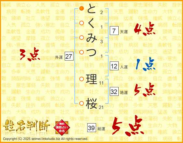 と(2画)く(1画)み(3画)つ(1画) 理(11画)桜(21画)